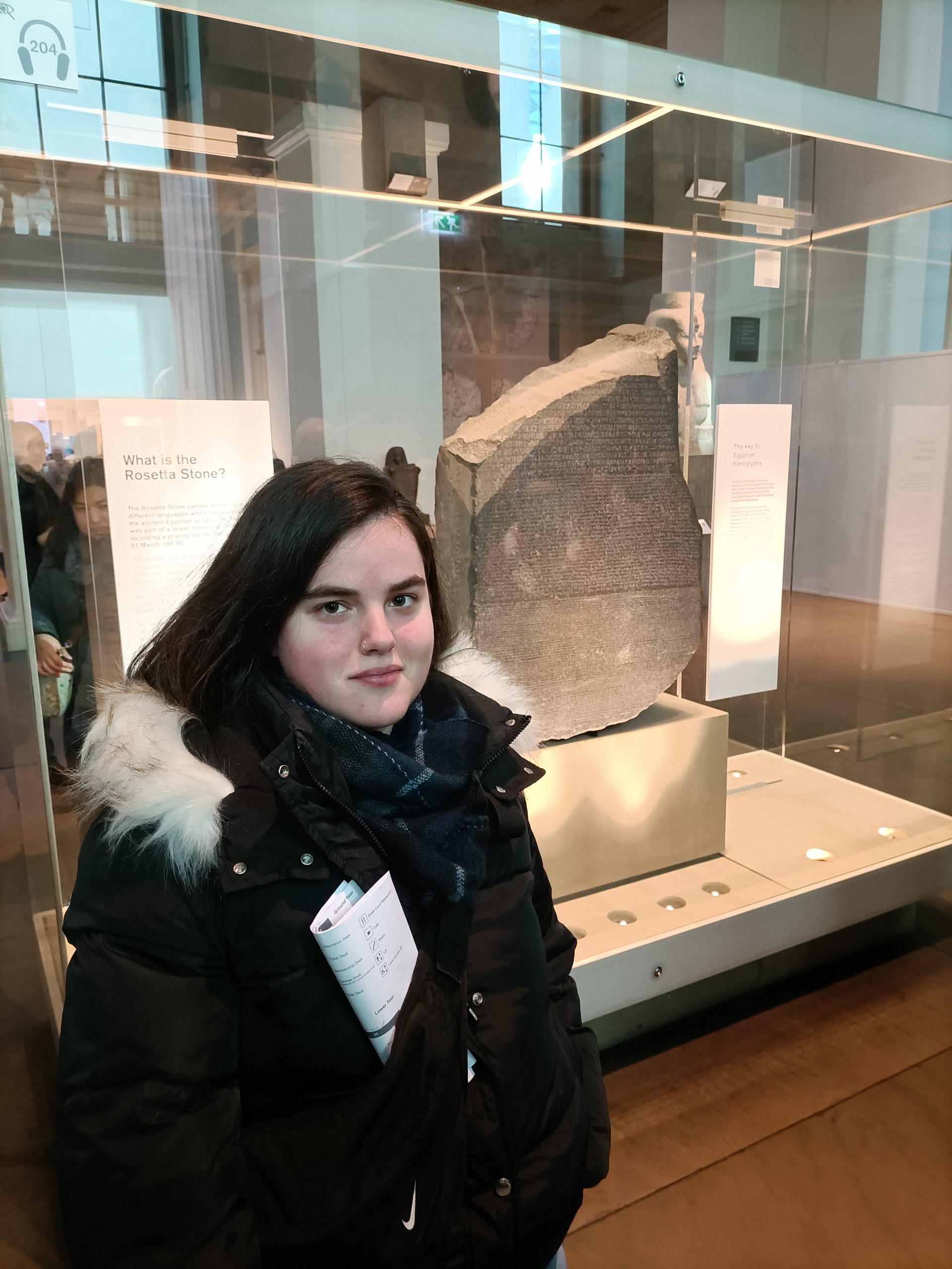 Al entrar al Museo Británico, quedé asombrada. La arquitectura es simplemente impresionante. Las columnas majestuosas y las galerías llenas de luz nos sumergen en un ambiente que respira historia y descubrimiento.