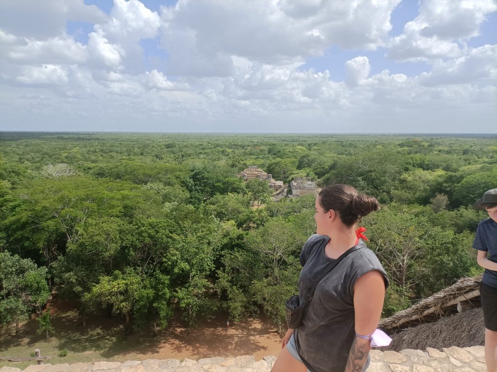 La visita continúa hacia un campo de pelota con paredes inclinadas muy diferente al de Chichén Itzá, y finalmente llegarás a la impresionante Acrópolis, la estructura más alta del complejo. La subida es exigente, pero las vistas desde arriba y las decoraciones bien conservadas valen el esfuerzo.